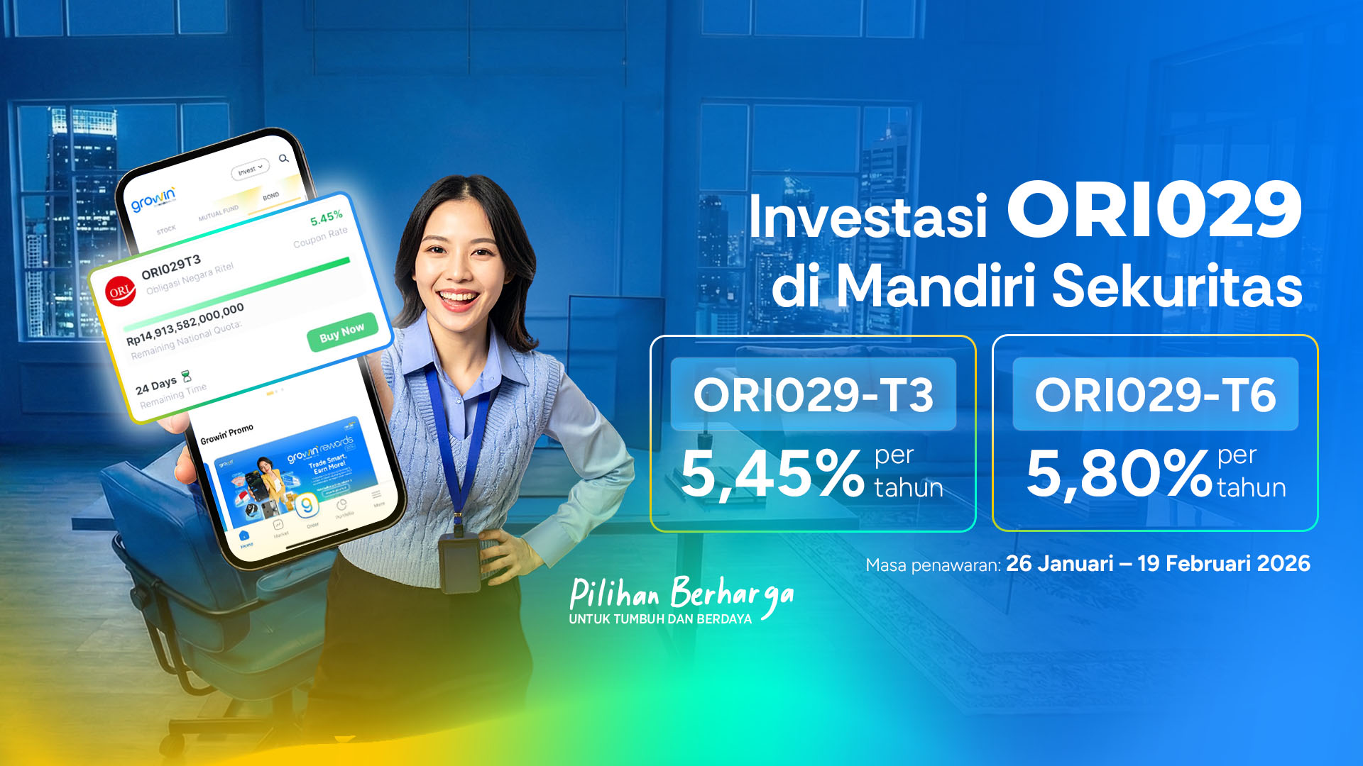PT Mandiri Sekuritas (Mandiri Sekuritas/Perusahaan) melalui platform digital Growin’ kembali menawarkan Surat Berharga Negara (SBN) ritel jenis Obligasi Negara Ritel (ORI) seri ORI029 yang diterbitkan oleh Kementerian Keuangan Republik Indonesia untuk investor individu. SBN ORI029 menawarkan imbal hasil yang stabil dan relatif tinggi bagi para investor, yaitu: 5,45% per tahun untuk tenor 3 tahun dan 5,80% per tahun untuk tenor 6 tahun.